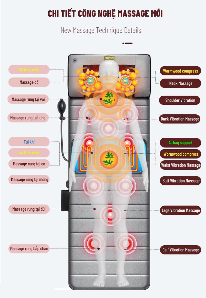 – Máy massage toàn thân: sử dụng 10 động cơ rung mạnh mẽ mang đến cho bạn một liệu pháp mát xa, thư giãn và tràn đầy sức sống giúp cơ thể bạn giải phóng căng thẳng, căng thẳng mệt mỏi, co thắt và cơ cứng sau một ngày dài.